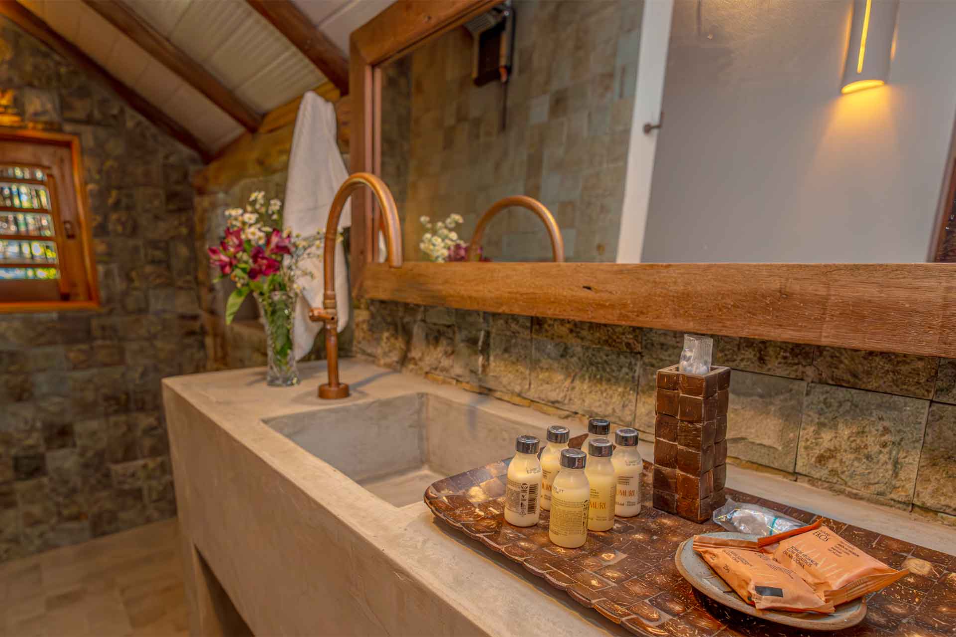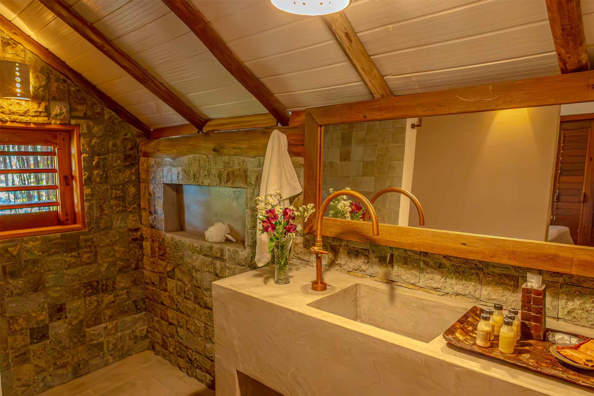 O banheiro da suíte é completo e inclui amenities de cortesia, proporcionando uma experiência ainda mais agradável durante a sua estadia.