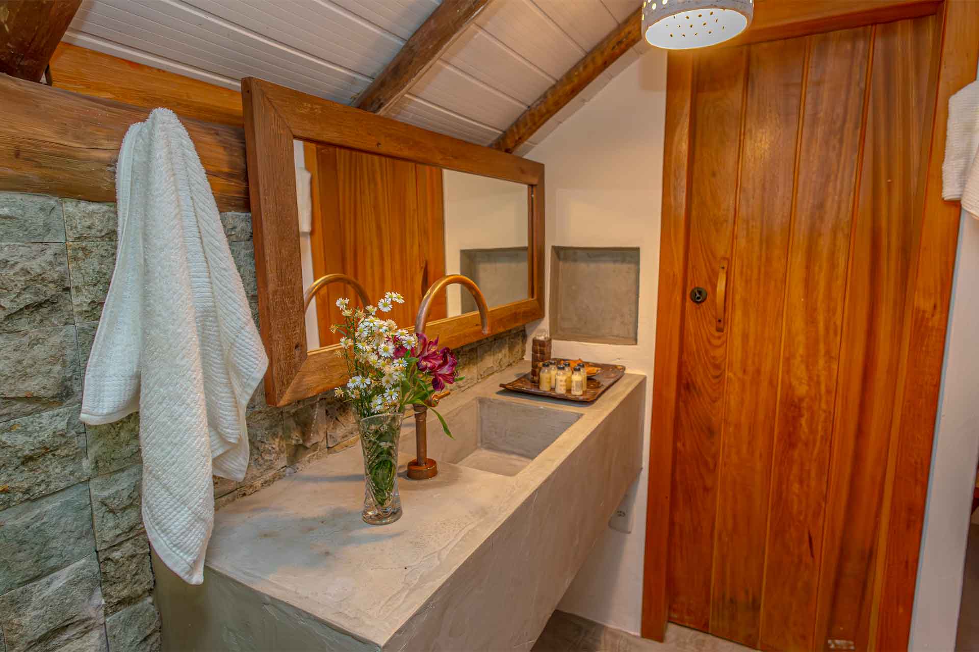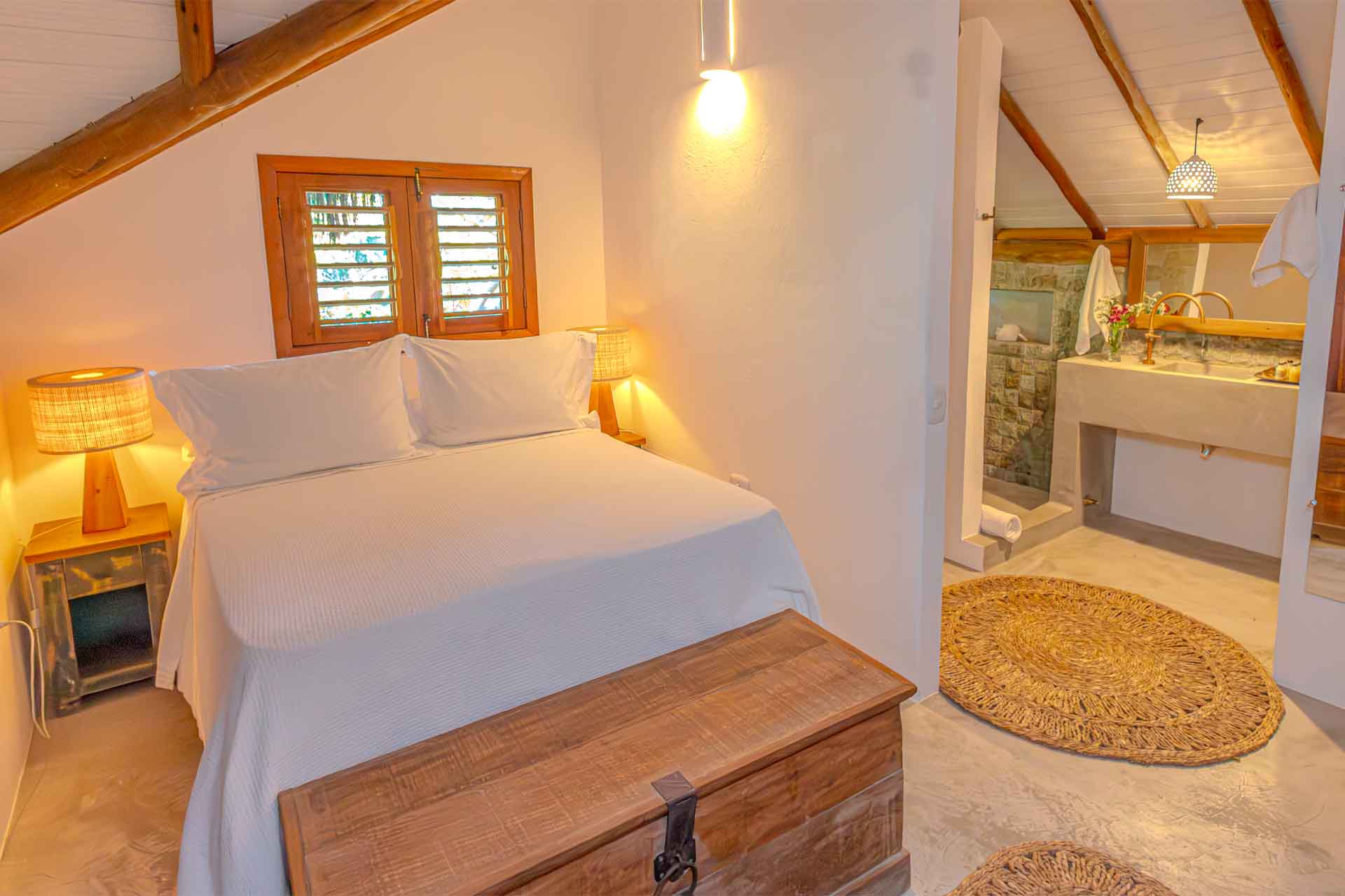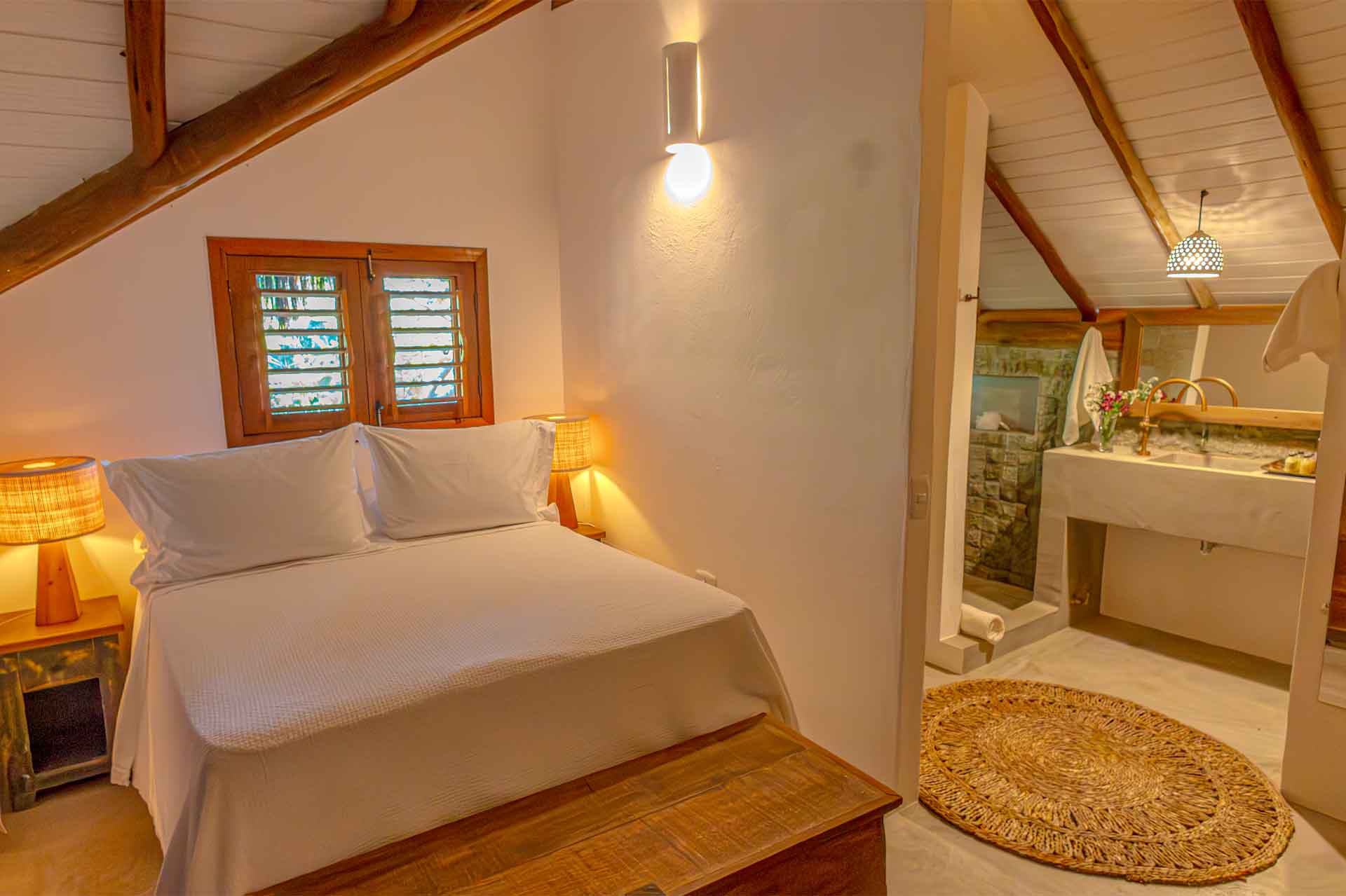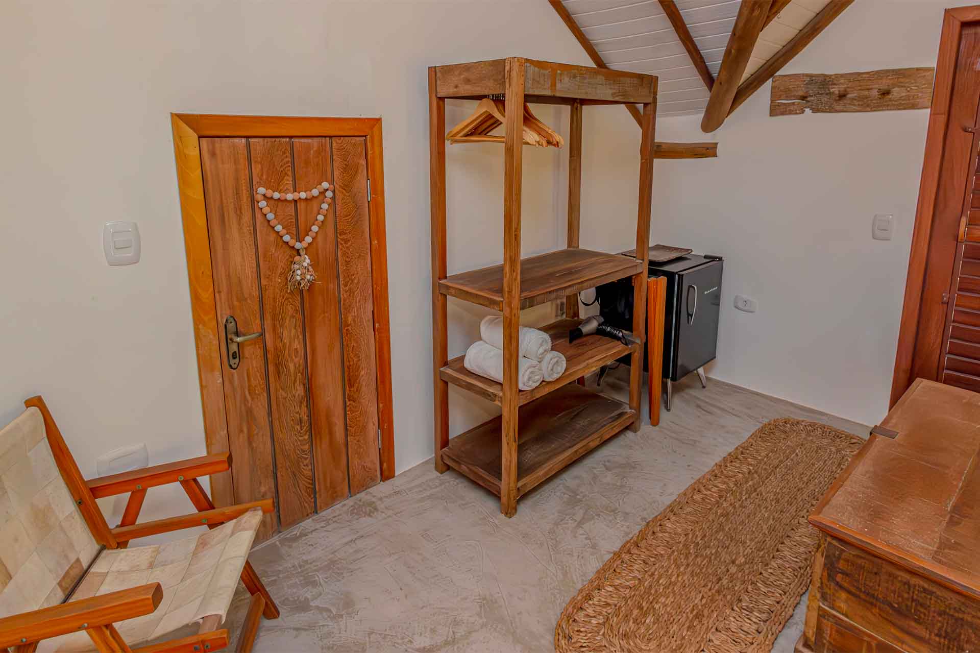 Para garantir o máximo de conforto, a suíte conta com dois aparelhos de ar-condicionado, permitindo que a temperatura seja ajustada conforme a preferência dos hóspedes. Além disso, o ambiente é equipado com um frigobar abastecido para sua conveniência e uma varanda privativa com rede, ideal para relaxar e aproveitar a vista.