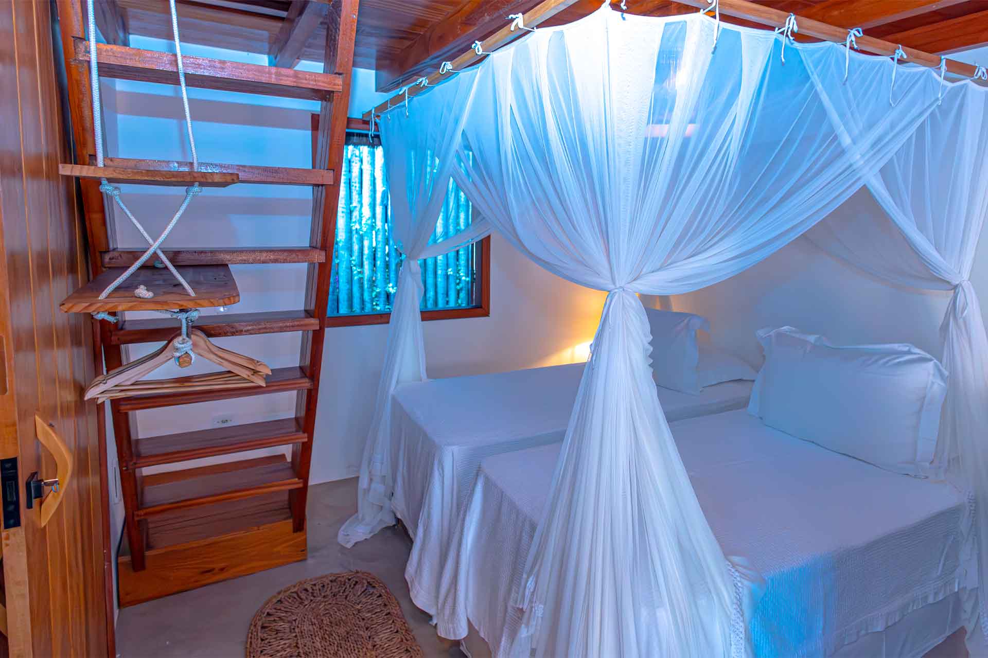 A suíte na Hayô Lua é perfeita para quem busca conforto e flexibilidade durante a estadia. No mezanino, você encontrará uma charmosa cama de casal, proporcionando um ambiente aconchegante e privativo. No térreo, a suíte oferece a opção de acomodação com uma cama de casal ou duas camas de solteiro, atendendo às suas preferências e necessidades.